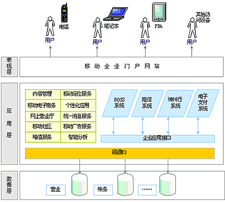 国信清联通行业门户解决方案是基于国信清的企业信息化产品E3系统自主开发的。国信清E3系统整体架构上采用先进的J2EE技术,充分考虑技术的先进性与扩展性,同时兼顾原有系统的重用及平滑移植,最大程度的保护了联通运营商的前期投资。