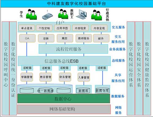 数字化校园是一项浩大的工程,我们已经从数字化校园的初始阶段,即建立网络基础架构和独立应用系统的阶段,进入到大集成、大融合的阶段。在这个阶段,我们只有做好顶层设计,打造坚实的数字化校园基础平台,才能使整个数字化校园真正为教学和科研服务,提高整个学校的核心竞争力。